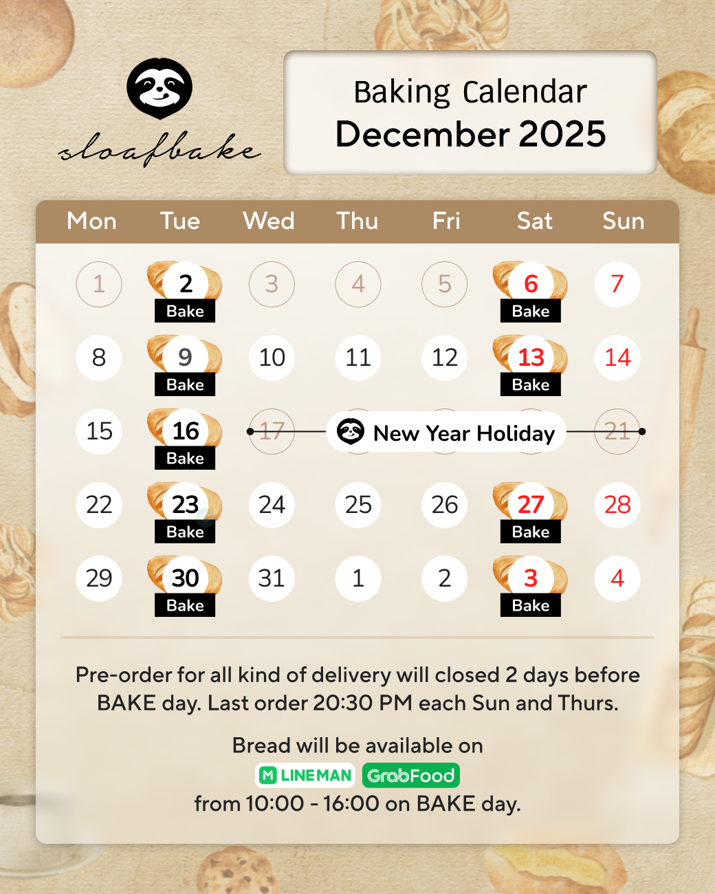 Sloafbake is homemade, artisanal sourdough bread, hand mixed by Nini-the baker and Somboon-the starter dough. Our co-creation is a slow-fermenting process over 30+ hrs. which produces bread with a distinctive taste, rich in nutrition and possesses good digestibility. Our main ingredients are flour, water, salt and any other optional ingredients as listed on the product detail.